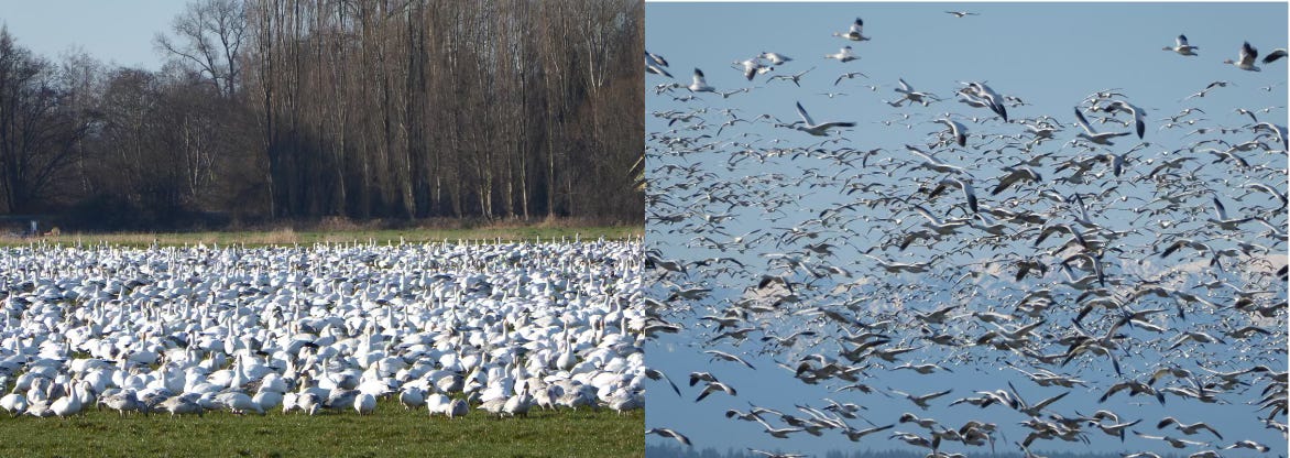 We generally focus on counting just a handful of species, primarily Bald Eagles and Red-Tailed Hawks. They are easy to see, identify, and count. More challenging, or at least far more numerous, are the big white birds: Trumpeter Swans, Tundra Swans, and Snow Geese. In a good year, they can total in the thousands and grace the sky and land with their brilliant plumage, constant conversations, and sheer abundance.