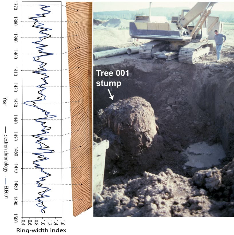 Thirty years later, geologist Pat Pringle was driving in Orting when he saw a construction site with buried trees. Most, or at least their stumps, still stood upright. He was able to cut sections out of about a half dozen, long dead Douglas firs, bring them into a lab, and age date them. One of them, ELE001 had a good set of rings showing that it died between 1476 and 1522. The dates confirmed Crandall’s time estimates for the Electron Mudflow but Pat wanted a more precise date. He finally got it, in part because of a new focus on tree ring research.