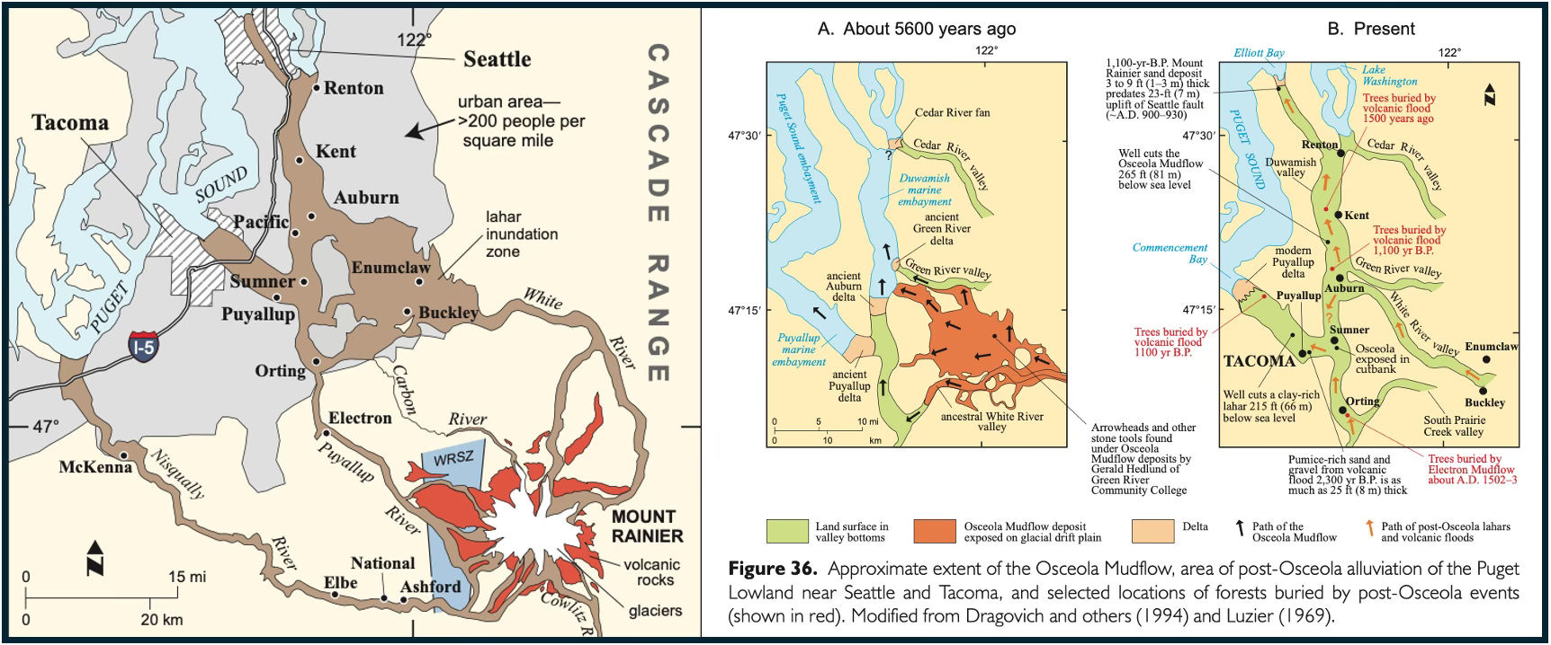 Tying into the cultural history of place and people who have lived here for thousands of years, the paper mentions two Indigenous stories that reference the Electron. “The young man’s ascent of Mount Rainier” (from Arthur Ballard’s Mythology of southern Puget Sound) and “The lake on Mount Rainier” (from Ella E. Clark’s Indian Legends of the Pacific Northwest) describe flood water and debris that buried the Puyallup River valley near the present town of Orting. As one member of the Puyallup Tribe told me, he has longed used these stories as a way to illustrate the enduring legacy of oral histories and how they often provide details later teased out by more recent science.