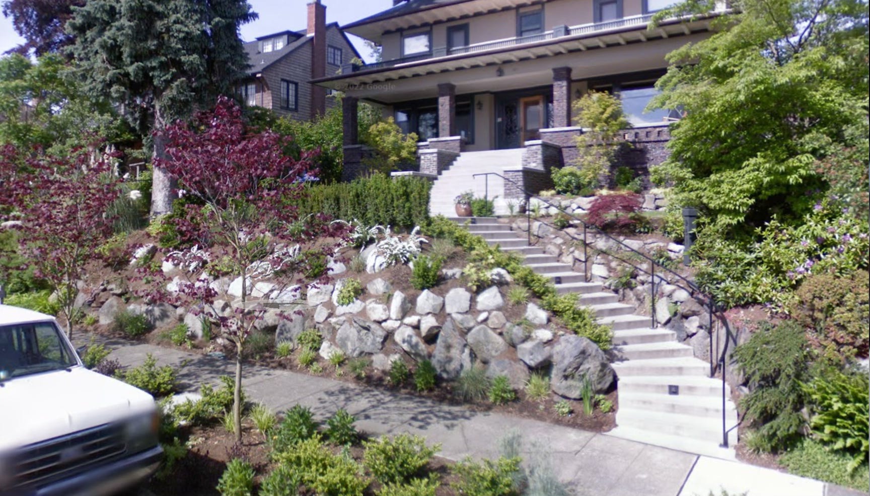 The alley where I ran had a short rise, whereas the streets to the north and south did not. While I cannot prove this, I think the reason why, is that it probably made sense when the streets were platted to regrade the street and not to alter the alley. Having a level spot in front of a house to park would generally be more important than backyard access, plus, having the house sitting above the street would make the house look more substantial. This seems logical to account for the many situations in Seattle where houses sit high above the street, often fronted by a rockery wall.
