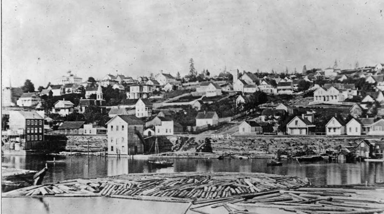 Edwards employed up to 90 men and used 20 mules and horses. They made their deepest cut of 25 feet at Spring Street and their greatest fill, an addition of eight feet, between Marion and Madison. Their extensive cribbing along the shorefront used cedars harvested from the woods behind Belltown, then more or less a suburb of Seattle. They raised many houses on stilts—some up to 12 feet—which would eventually be supported by fill. Others were left high above the road, which required homeowners, such as Arthur Denny, to build what was described as a “prevent wall,” to prevent their houses from sliding.
