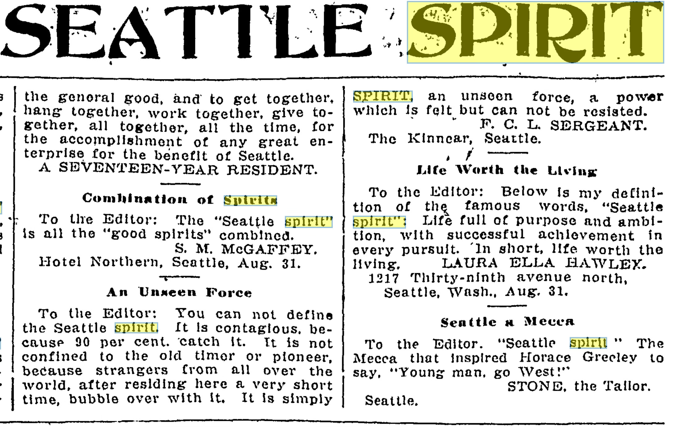 Word of the Week - Seattle Spirit - The earliest appearance in print I can find of this phrase comes from the Seattle Post-Intelligencer from July 23, 1884. It was used in reference (“quiet determination and earnestness…that augurs well for the future of Seattle”) to the need to build a railroad to reach new coal fields. In 1907, the P-I asked its readers to define the Seattle Spirit. The answers were rather spirited.