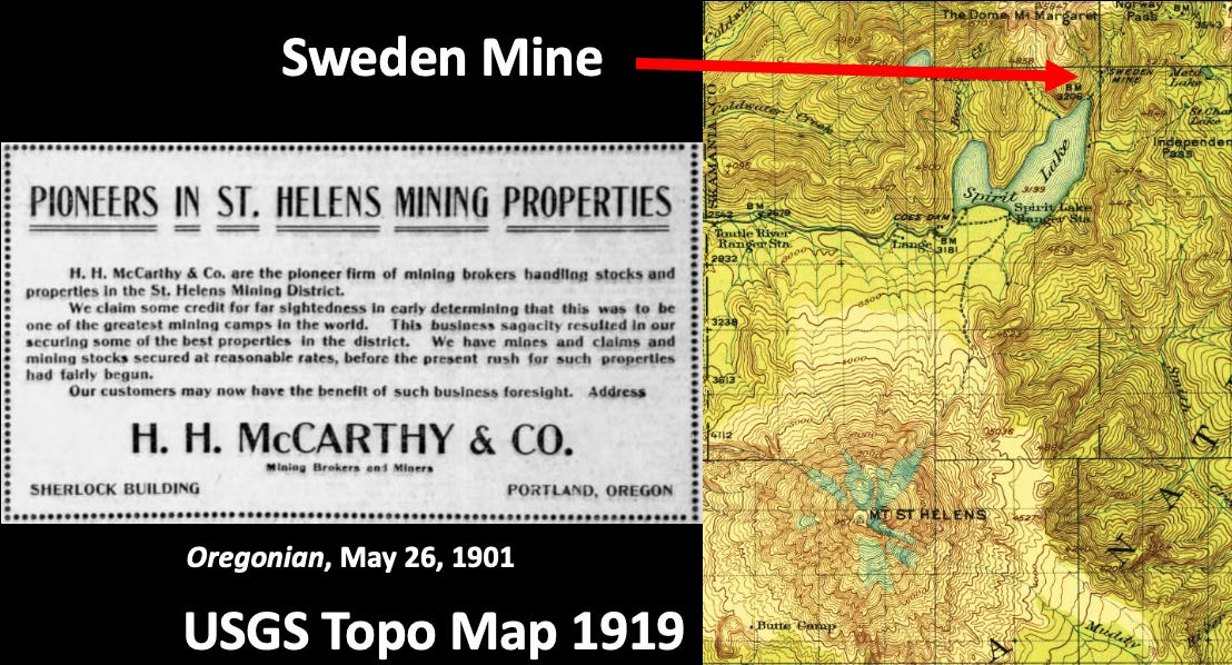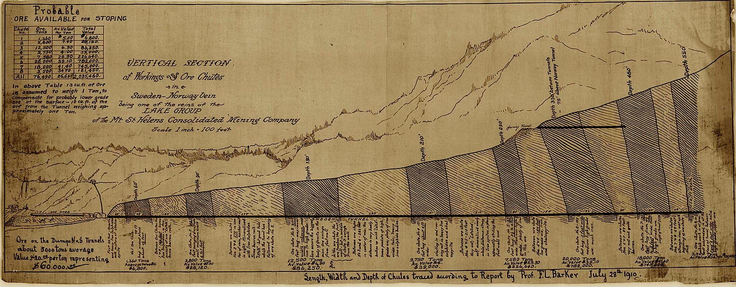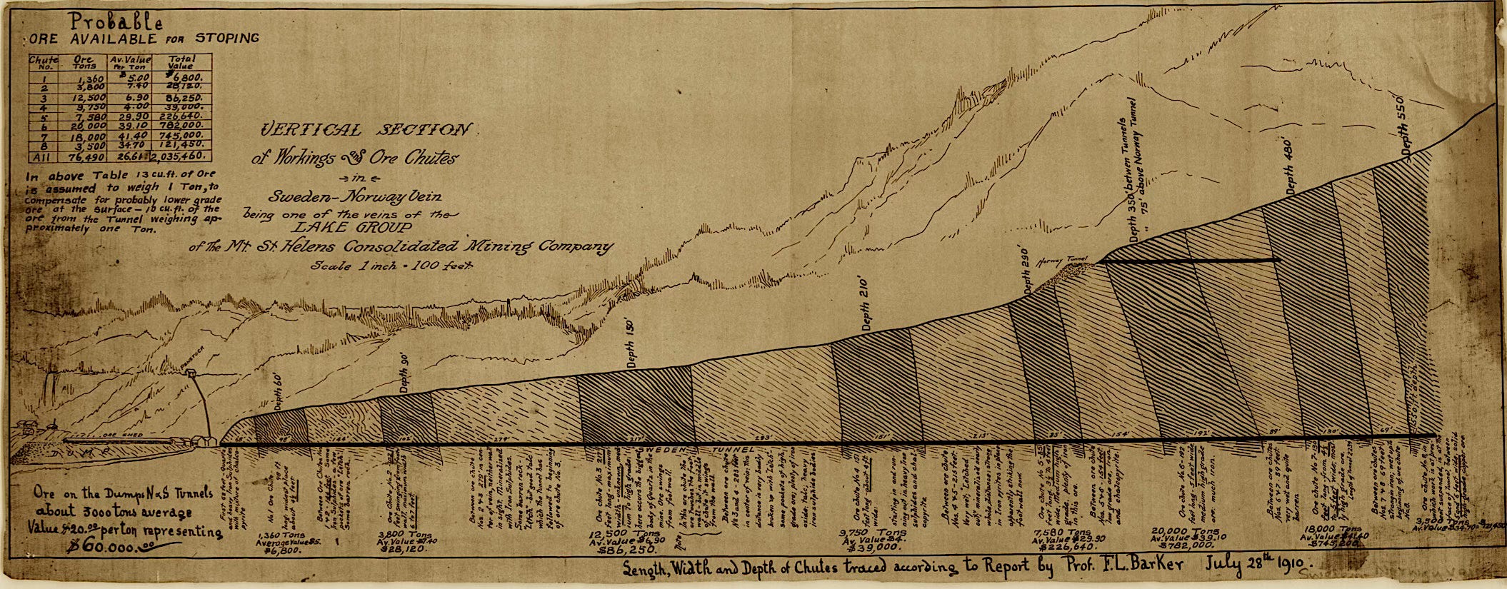 Leading the mineral-hungry pack at the end of the 19th century was Dr. Henry Waldo Coe of Portland. A physician who had spent time in North Dakota and Alaska, he was a bank president, besotted with mineral fever at the volcano, and friends with President Teddy Roosevelt. Coe eventually sold $700,000 in shares of the Mount. St. Helens Consolidated Mining Company, including to the President. The company worked several mines with names such as Norway, Sweden, and Denmark. They eventually drilled the longest tunnel in southwest Washington, 2,291 feet into the Swedish mine, and by 1910, prospectors had dug test pits and drilled more than 11,000 feet of tunnels.