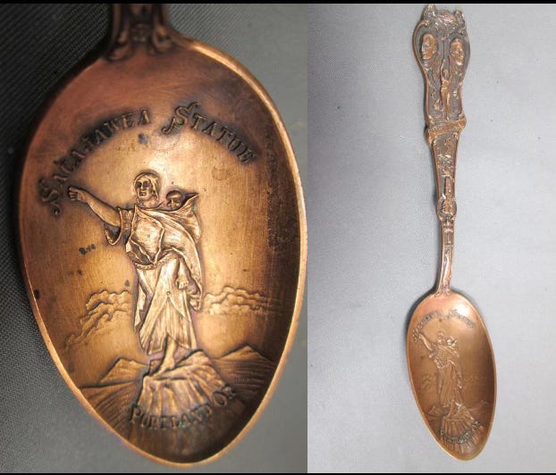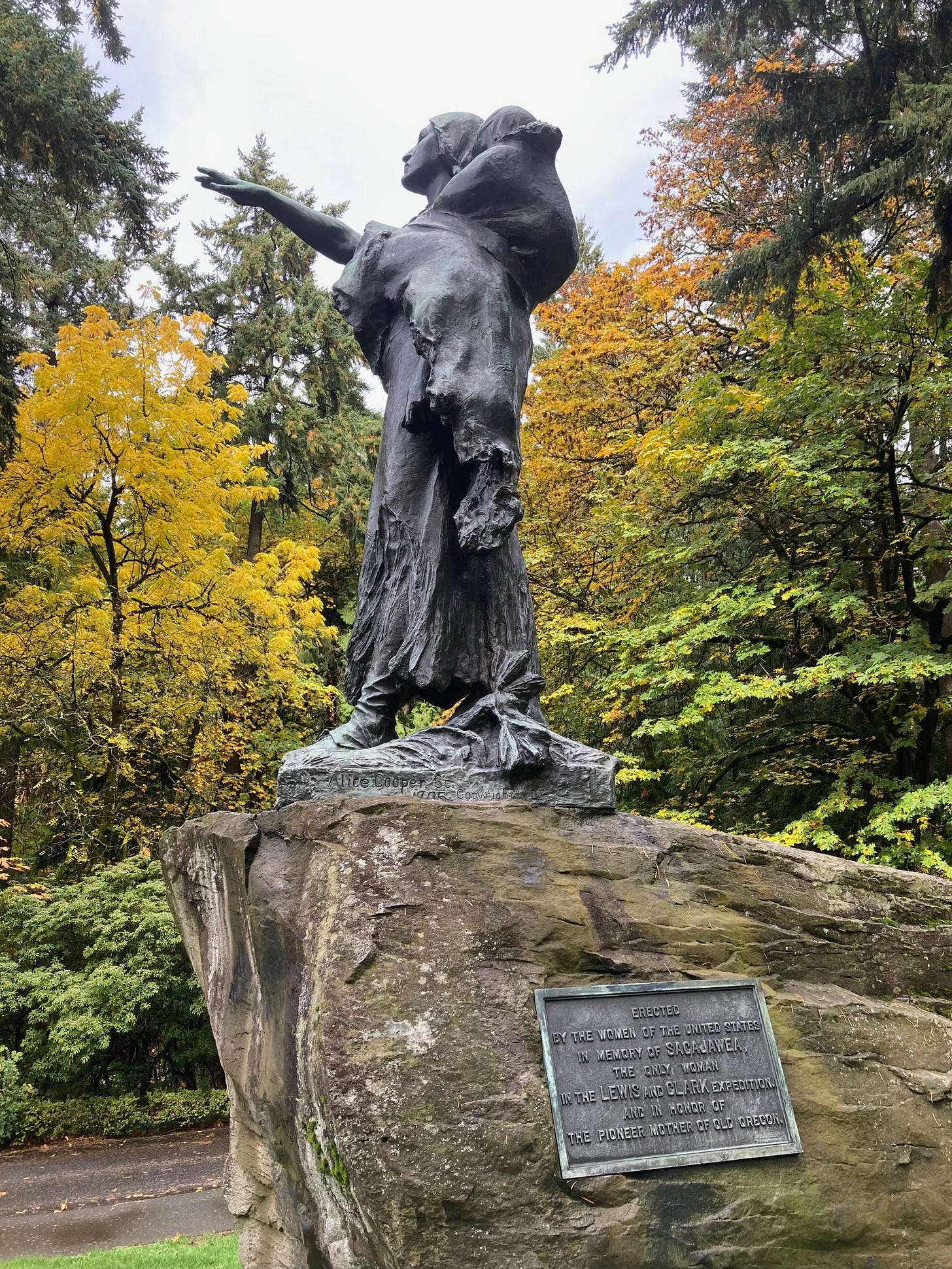 Alice Cooper was the sculptor of the monument. Born in Iowa, she attended school in Chicago but spent most of her adult life in Denver. She may have worked on sculptures for the 1893 Chicago World’s Fair but not enough is known about her to confirm. Newspaper articles from the era report that various people sent photos/drawings to Cooper to help her imagine Sacagawea. After making the initial model in clay, it was created in bronze at the New York foundry and then shipped back to Portland.