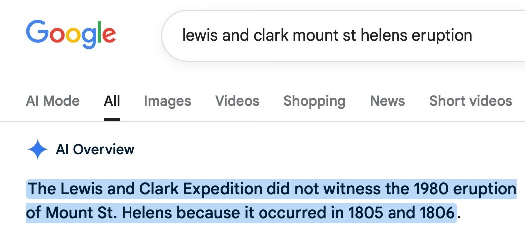 While researching this newsletter, I couldn’t remember if the L&C Expedition had seen MSH erupt so I did what we all do and typed a few words into Google. Here’s what I typed and the AI response. To paraphrase what I have heard about some people, AI has an acute grasp of the obvious.