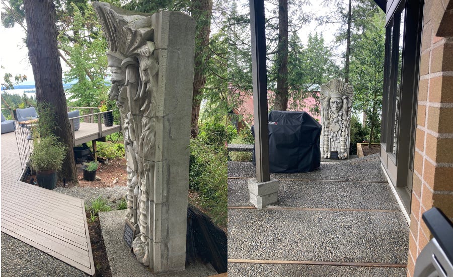 For many years I have been on a quiet hunt for a series of famous Seattle sculptures: large, terra cotta figures formerly high atop a downtown building. This past weekend, I found one, deep in the wilds of Kirkland, at a house for sale. It stood outside off to the side of a deck, keeping eye on a barbecue. It is the seventh one I have found, though I have also lost track of one of them.