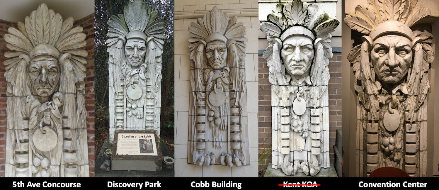 In 1975-1976, workers razed a landmark trio of buildings in downtown Seattle. The White (1908-1909), Henry (1910), and Stuart (1914-1915) buildings were built separately with matching exteriors that gave them the appearance of a single, unified structure. Looking down were 16 terra cotta figures of Native Americans. Chester White, who was responsible for his eponymous building, wanted to honor Seattle’s Native history and asked for the figures.