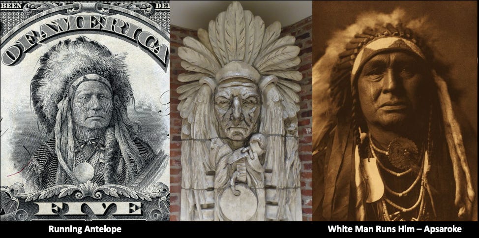 Unfortunately, the figures bear no resemblance to the Indigenous people of the region, who did not and do not wear headdresses adorned with feathers. Instead, the terra cotta men most closely resemble two images: Edward Curtis’s White Man Runs Him and Running Antelope from the 1899 $5 silver certificate. White was friends with Curtis, which lends more credence perhaps to the Curtis image.